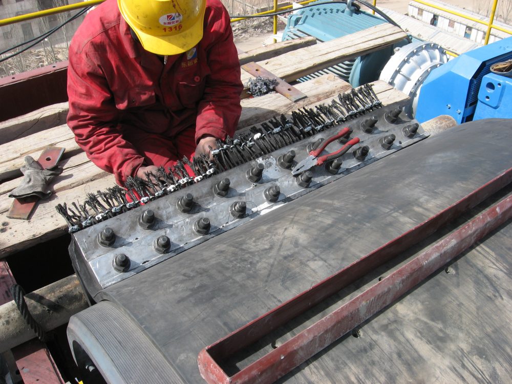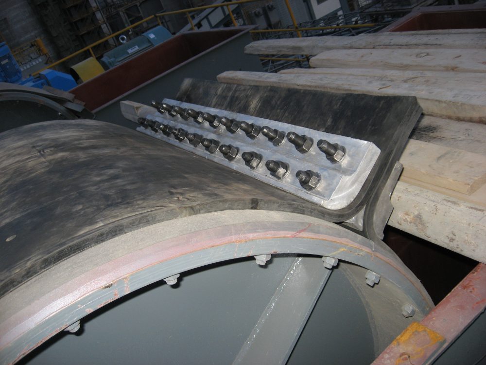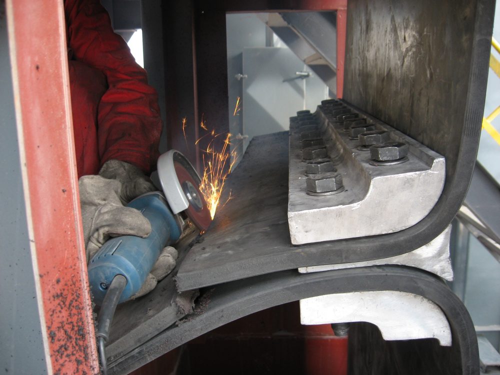 鬥提升機輸送帶為條帶狀結構,裝配時需要采用夾具,將膠帶的兩個端部連接固定成為環狀,實現在滾筒帶動下連續運行。